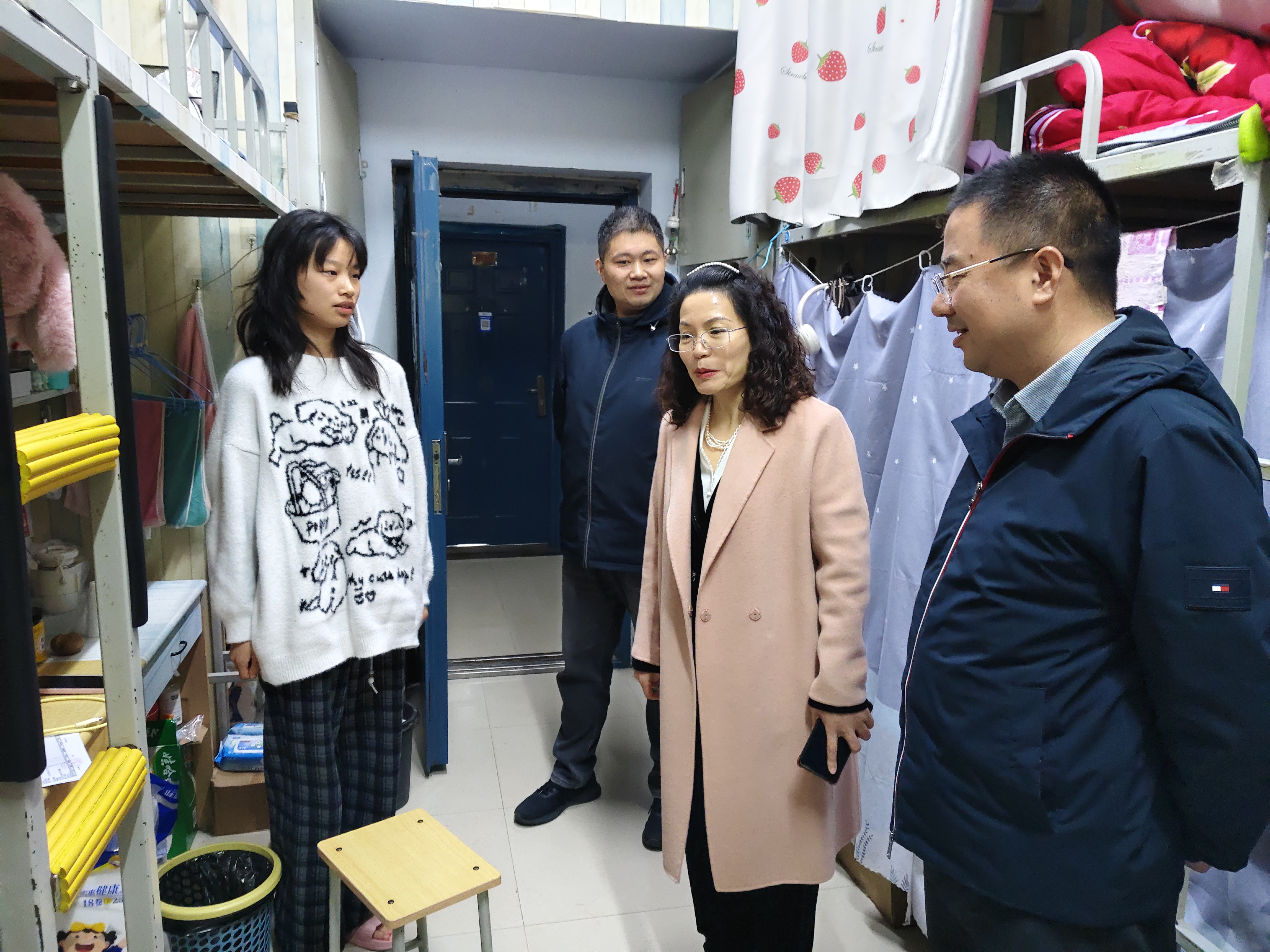 会后,李玲玲带队深入学生宿舍开展安全专项检查,并走访慰问在校学生。走访过程中,李玲玲仔细察看学生用电安全及卫生状况,与同学们亲切交谈,详细了解大家的学习生活情况、考研备战进度及存在的实际困难。她叮嘱同学们要增强安全意识,遵守宿舍管理规定,注意防火防盗,共同营造安全、整洁、和谐的住宿环境。