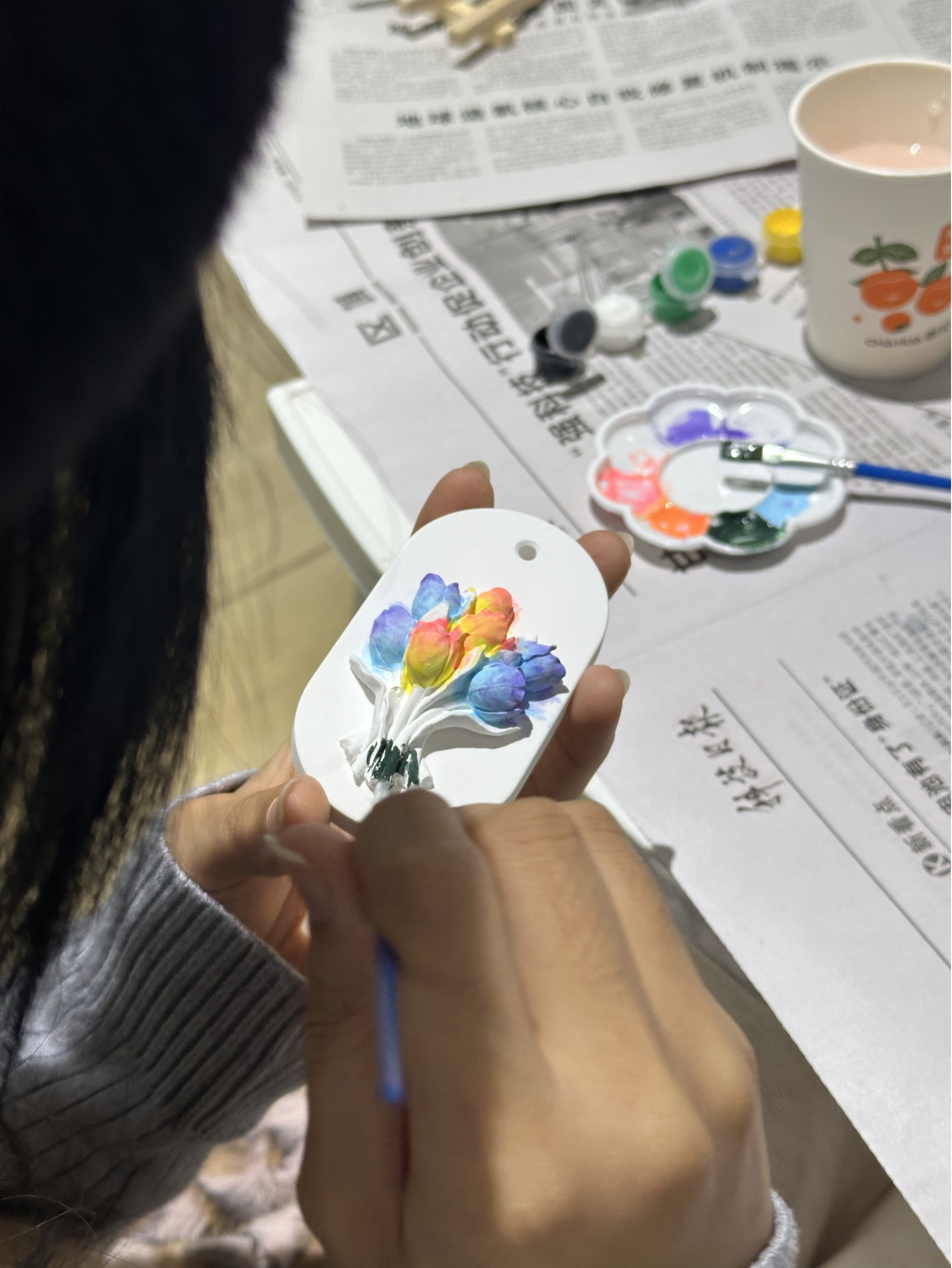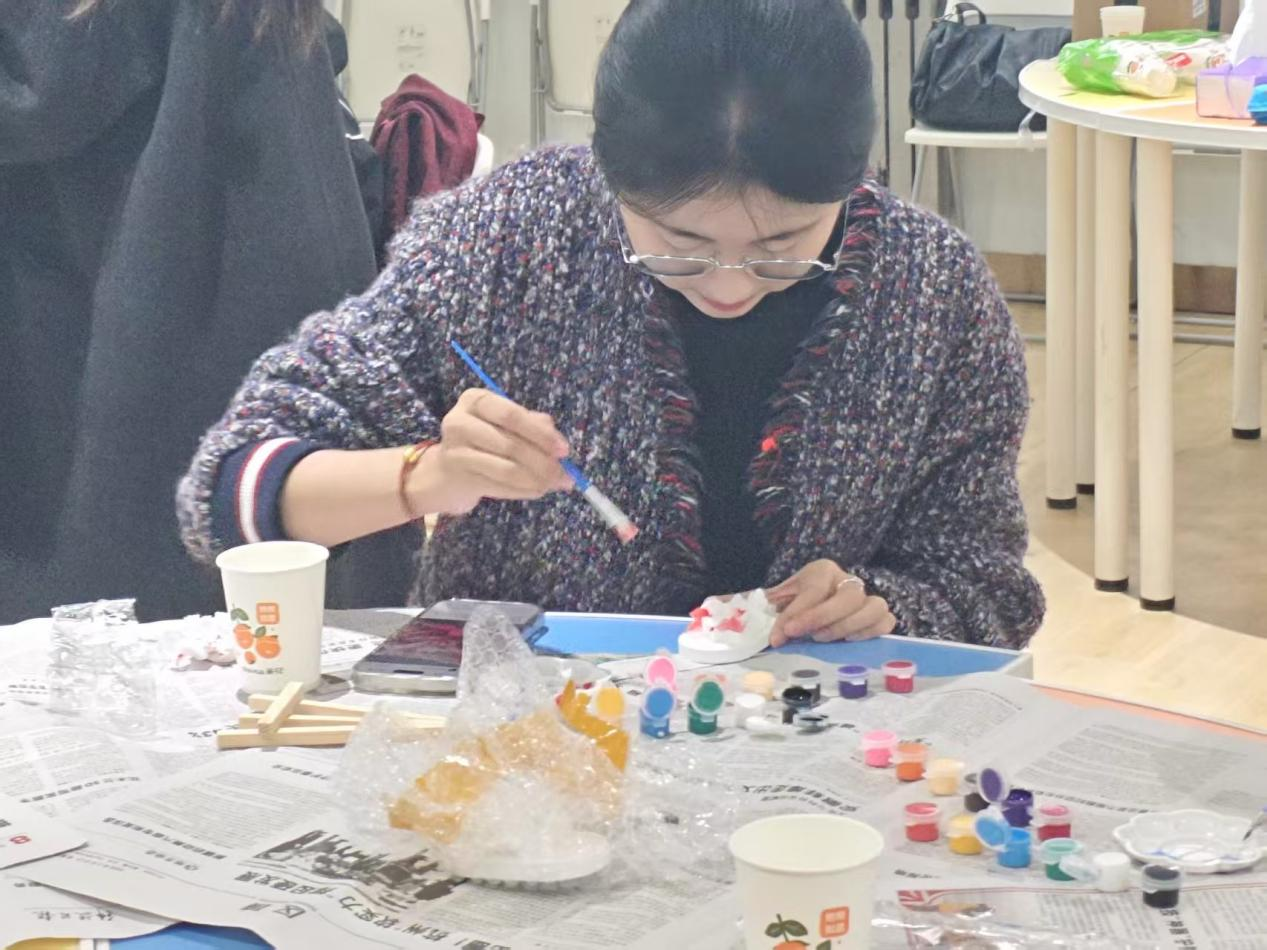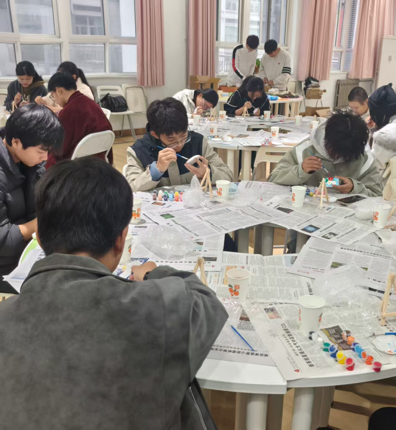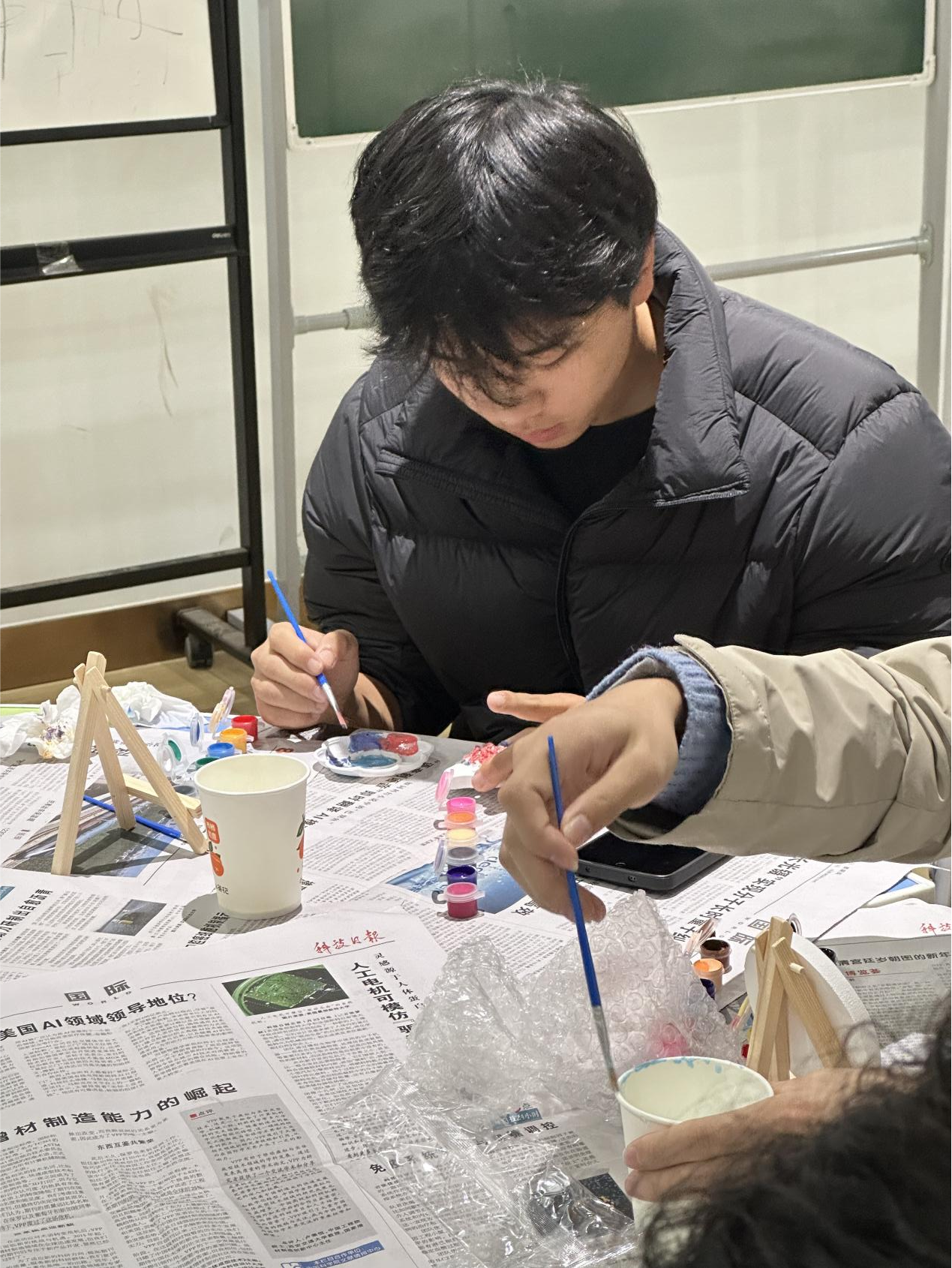 一位正专心涂色的同学分享道:“给这种立体的石膏上色和平时在纸上画画感觉很不一样,笔触要顺着凹凸的纹理走,很有意思。整个过程非常专注和治愈,看着它从白色变成我专属的彩色作品,特别有成就感!”
