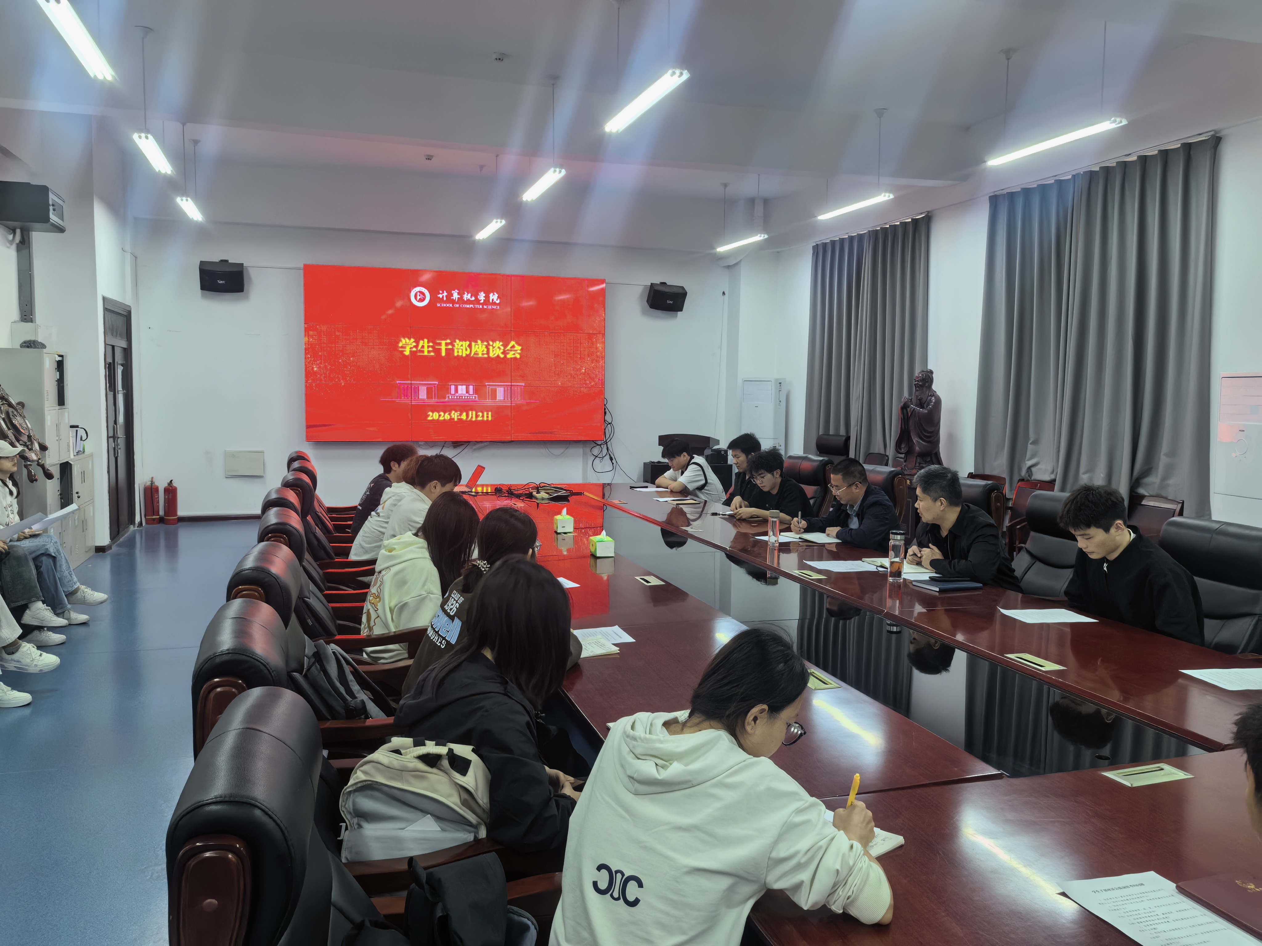4月2日,计算机学院在06B202会议室召开学生干部座谈会。学院党委书记吴红兵、副书记张培源出席会议,2024级学生干部代表参加座谈。