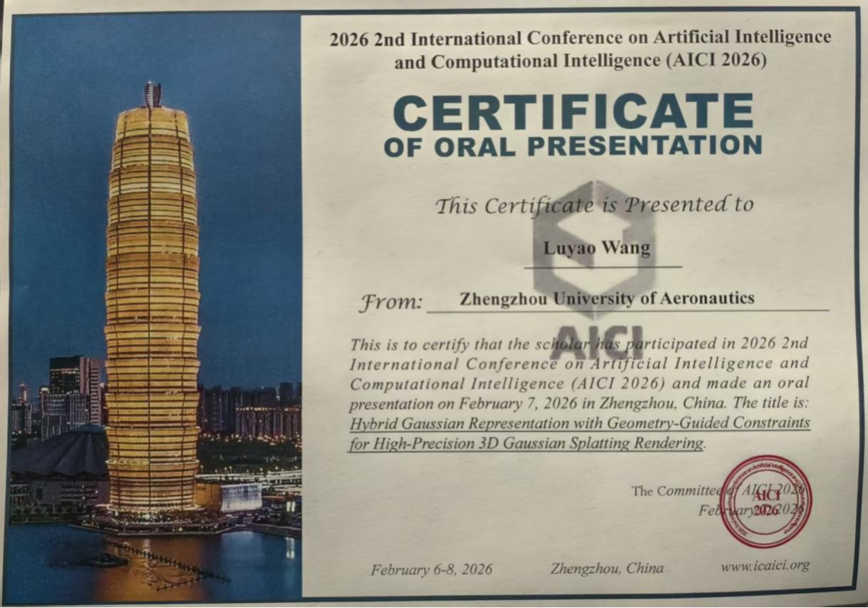 2026年2月6日-8日,郑州大学主办的“第二届人工智能与计算智能国际学术会议”(AICI2026),在河南省郑州市召开。本次会议汇聚了多个知名高校、顶尖科研机构及行业领军的专家学者、技术骨干与青年学子参加。会议围绕“进化计算”“神经网络”“机器学习与数据挖掘”“人工智能”等前沿核心议题,通过主旨报告、口头汇报、海报展示等多元形式,开展全方位、深层次的学术交流与思想碰撞,为领域内同仁搭建了高效的成果共享与合作对接平台。 我院2023级研究生王璐瑶同学(指导老师:张彦山副教授)撰写的学术论文《Hybrid Gaussian Representation with Geometry-Guided Constraints for High-Precision 3D Gaussian Splatting Rendering》在现场进行了口头报告。论文梳理了3D渲染的发展脉络与现实挑战,系统阐述了团队在核心技术路径、方法创新及应用场景拓展等方面的关键突破,结合详实的实验数据与典型案例,直观呈现了研究成果的性能优势与实践价值。 此次参会交流,不仅能够让研究生近距离接触到领域内最前沿的研究动态与技术趋势,拓宽了学术视野,也进一步加强了我院与国内外同行的学术联系,为后续开展相关科研合作奠定了坚实基础。未来,学院将继续激励研究生参与国内外学术活动,持续深化研究生培养模式改革,全面提升研究生科研创新能力,培养更多适应行业发展需求的高素质创新型人才。